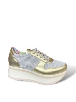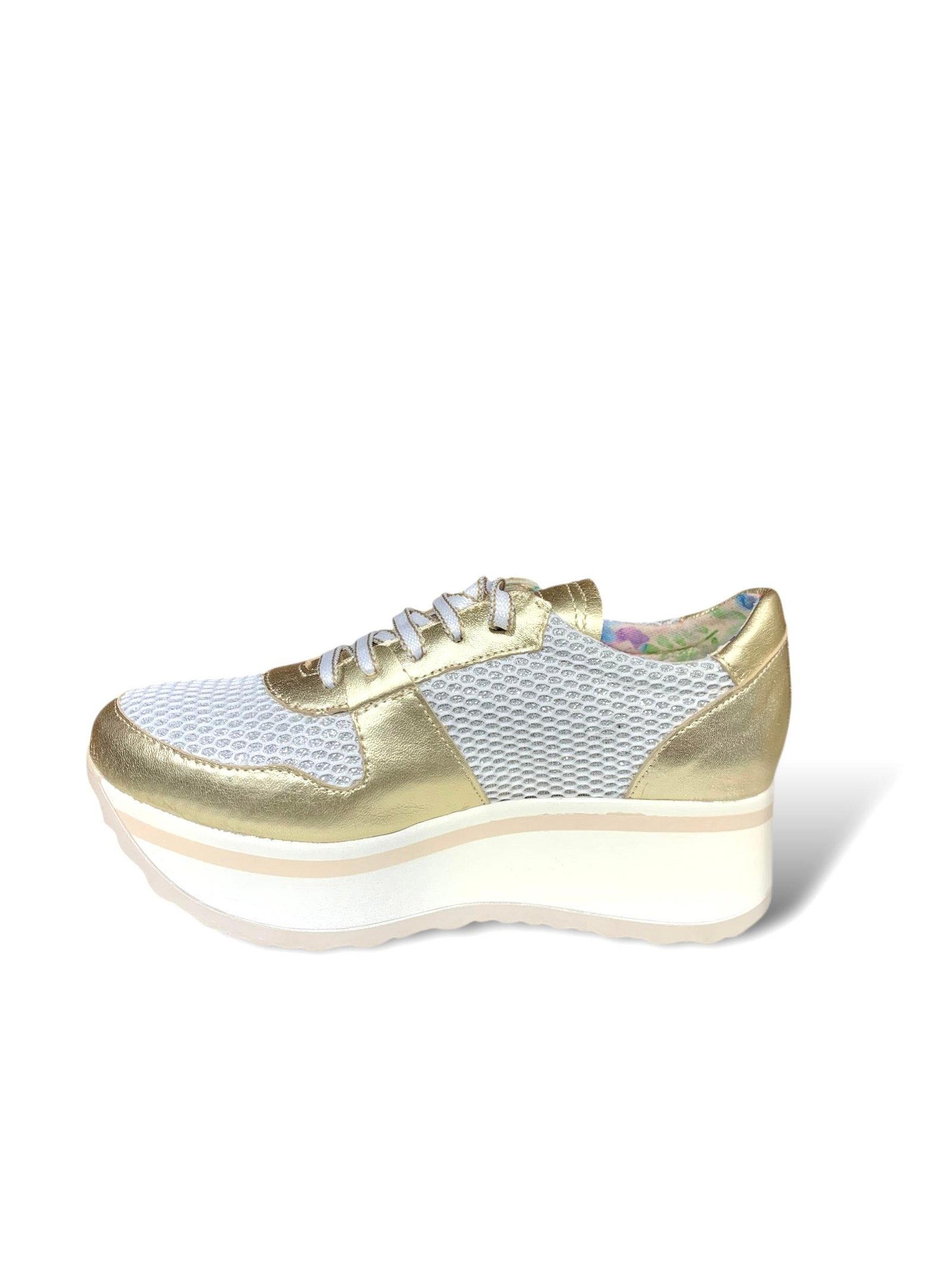 Zapatilla de cuero dorada con malla blanca, hecha en españa.