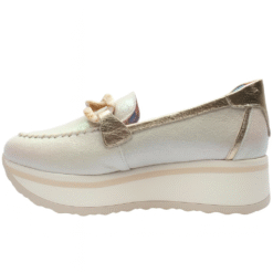 Elegancia y confort se unen en este mocasín de cuero blanco Jose Saenz, diseñado y fabricado en España con la calidad artesanal que distingue a la marca. Su acabado perlado con sutiles reflejos dorados y el detalle de cadena en tono beige crean una combinación moderna y femenina.